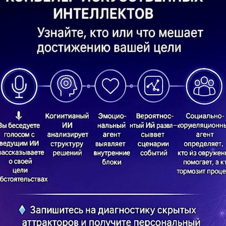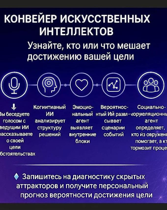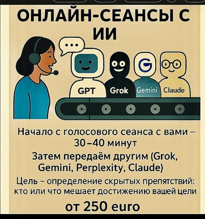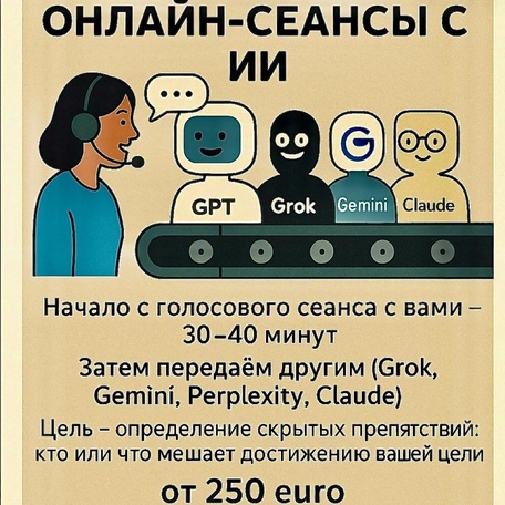🔮 Определение скрытых препятствий вашей жизни - кто или что мешает достижению вашей цели. Разрешение любых жизненных проблем с помощью ИИ. 💠 Как это работает Ваш путь начинается с индивидуального голосового сеанса (30–40 минут) с фасилитатором- искусственным интеллектом GPT-5 — в формате живого диалога. Мы вместе определяем цель, скрытые препятствия и вероятные сценарии событий. После этого ваша ситуация проходит через Конвейер Искусственных Интеллектов — четыре независимых системы мирового уровня: Grok AI, Gemini, Perplexity и Claude. Каждый из них анализирует задачу под своим углом — психологическим, логическим, системным и вероятностным. Результат — единый синтезированный прогноз и карта скрытых аттракторов: • какие силы или факторы мешают достижению цели, • что усиливает движение к результату, • как можно переписать вероятность события в свою пользу. 🧠 Подходит для: • разрешения конфликтов, неудач, тупиковых ситуаций; • восстановления внутреннего баланса; • поиска решений в бизнесе, здоровье, отношениях, самореализации. 💬 ормат: онлайн (Zoom / Google Meet) ⏱️ Продолжительность: 30–40 минут 🌍 Языки: русский / английский / сербский 💳 Стоимость: от 250 евро за полный цикл анализа (включая все 4 ИИ) ✨ «Конвейер ИИ» —когда несколько интеллектов работают на вашу жизнь, а не против неё. Для получения услуги пишите на электронную почту: office@whsagency.info